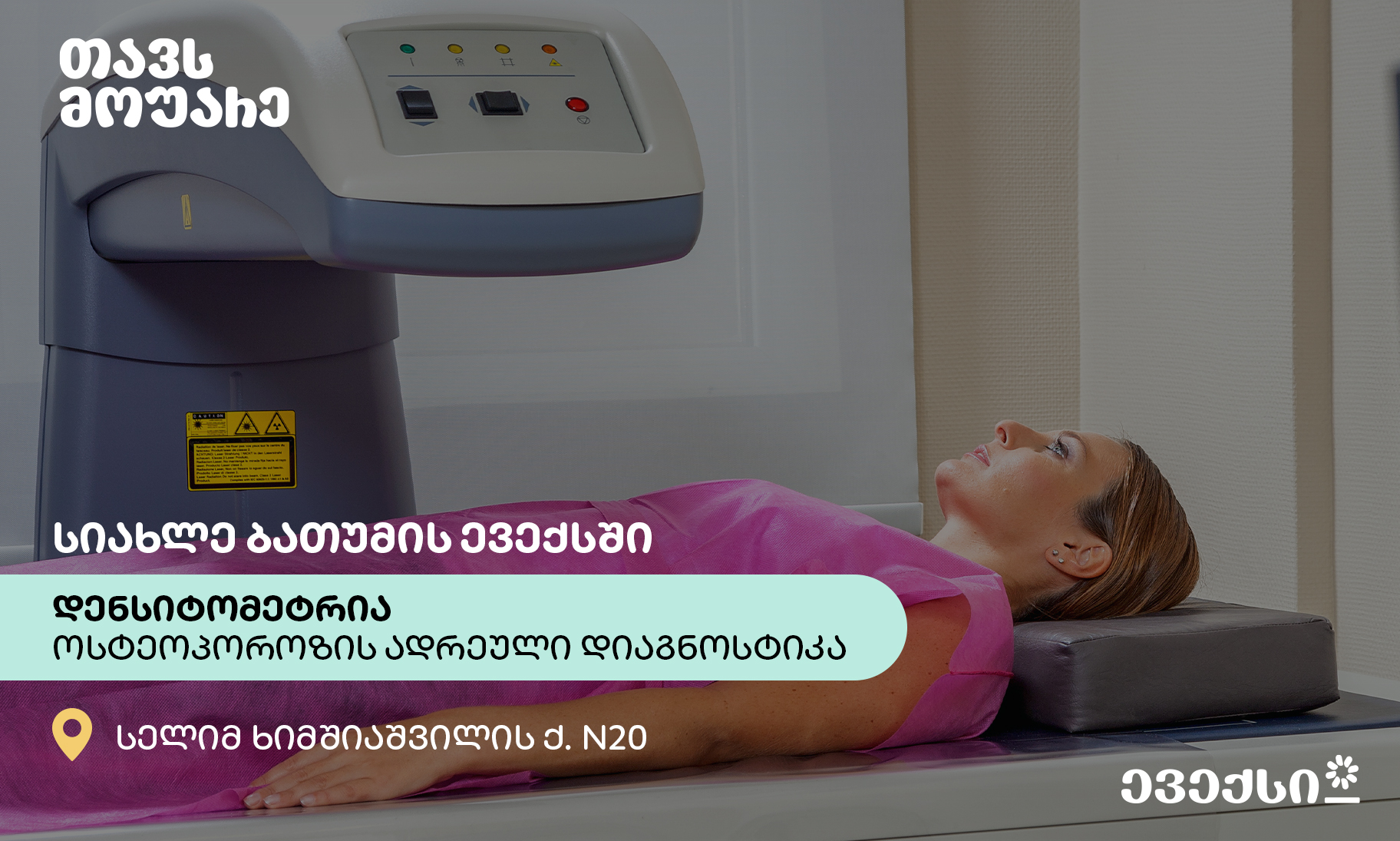 დღეიდან ევექსის ბათუმის კლინიკაში (სელიმ ხიმშიაშვილის ქ. N 20) დენსიტომეტრიის ჩატარებას შეძლებ.